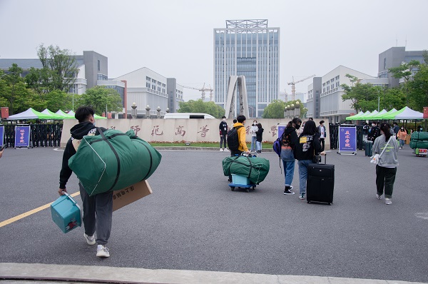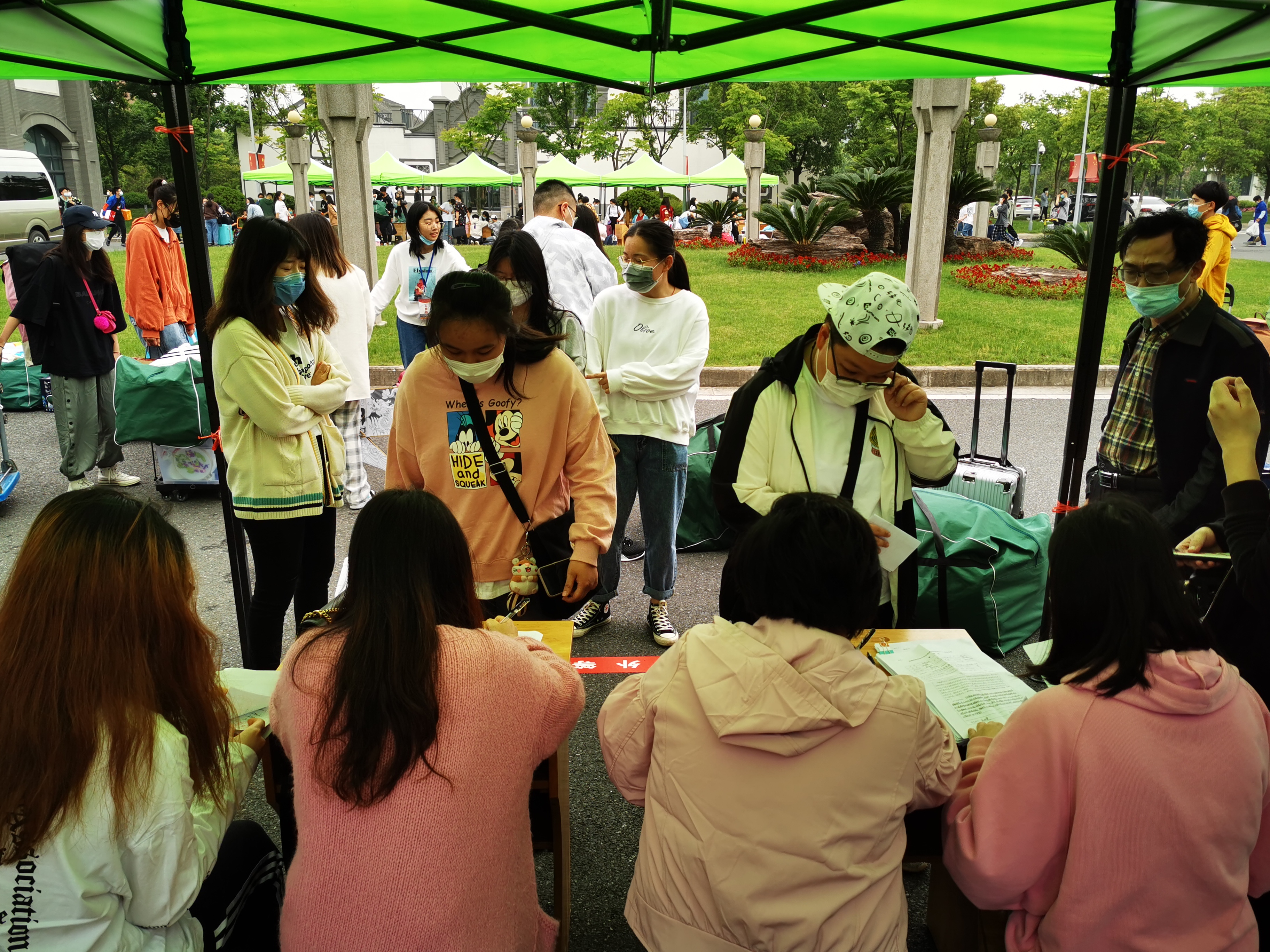 学生返校时,首先在校门口接受保安的体温检测,在志愿者的协助下将行李先安置到指定地点,然后到各班班主任处报到。班主任核验苏康码、收取承诺书、确认学生主要行程路线无误后,填写“返校学生报到信息表”并签字,再发给学生 5月10日当天的临时通行证材料。手续全部完成后,返校学生在志愿者的协助下,将行李运回宿舍安置整理。截至下午两点,我院除1名学生请假其余165名初招班学生顺利返校,经检测核验一切正常。