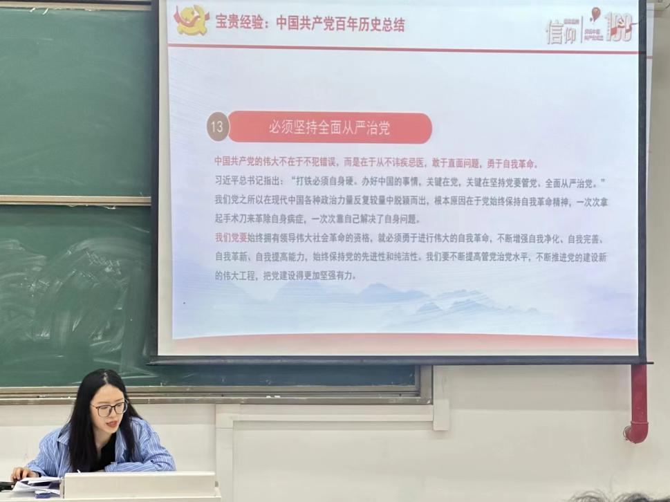 5月11日,由蔡佳艳老师主讲党史,她从开天辟地——完成救国大业、改天换地——完成兴国大业、翻天覆地——推进富国大业、惊天动地——实现强国大业四个维度,介绍了中国共产党走过的百年光辉历程。