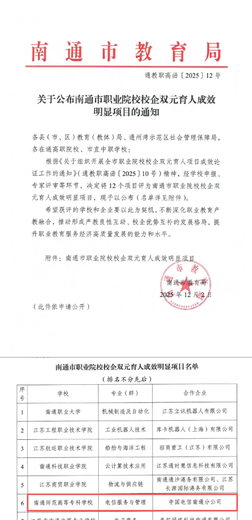 近日,南通市教育局发布了《关于公布南通市职业院校校企双元育人成效明显项目的通知》,智能信息学院院电信服务与管理专业凭借突出的校企合作成果及育人实效,入选该名单。这一荣誉标志着我校在深化产教融合、推动校企协同育人方面取得了阶段性显著成效,获得了政府部门的正式认可。