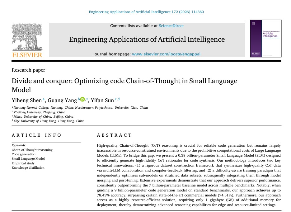 近日,我校智能信息学院沈逸恒老师联合国内科研团队的研究成果"Divide and Conquer: Optimizing Code Chain-of-Thought in Small Language Model"正式发表于人工智能领域国际权威期刊《Engineering Applications of Artificial Intelligence》2026 年刊。该成果以南通师范高等专科学校为第一作者单位,实现了我校中科院一区 Top 期刊论文零的突破,标志着我校在人工智能轻量化模型与代码生成领域取得重要进展。